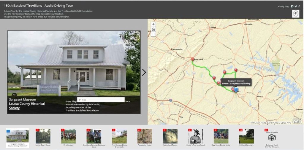 Created by the Louisa County Historical Society and the Trevilians Battlefield Foundation. The tour begins at the Sergeant Museum and through 11 stops, detailing Louisa’s Civil War history. This Audio Tour is a great way to interact with local history.